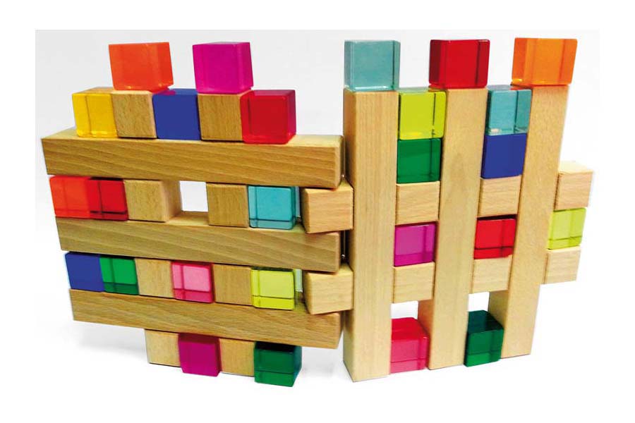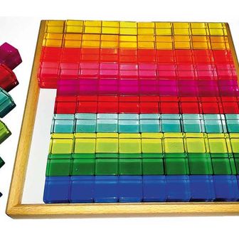 25 Facettenwürfel (in 5 Farben sortiert) werden in der Bauecke zu herrlich durchscheinenden fenstern. Bei Durchschauen in der Hand wird die Welt vervielfacht und sehr spannend. In den Farben: Gelb, Rot, Lila, Blau und Grün. Kastengröße: L/B/H = ca. 27,5*27,5*2,5 cm, Würfelgröße: L/B/H = ca. 5*5*2,5 cm.
