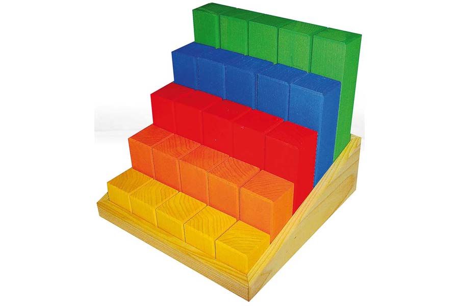 Im Holzrahmen. Die Treppe hat 25 Teile in 5 Farben ( wie auch die Bögen ). Damit können sehr gut Größenvergleiche angestellt werden. Rahmen: 22*22*3/7 cm. Stempel je 5 x: 4*4*5 cm, 4*4*10 cm, 4*4*15 cm, 4*4*20 cm, 4*4*25 cm