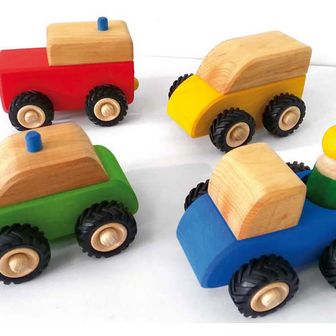 Schöne große Holzfahrzeuge mit Profilrädern und Fahrer, bzw. Beifahrer. Die Holzfiguren haben 2 verschiedene Formen, passend für Jungen und Mädchen. Das Set besteht aus folgenden Fahrzeugen: Rennauto mit Fahrer: 20*11*7 cm, Omnibus mit Fahrer und Passagieren: 21*11*9 cm, Traktor mit Fahrer: 16*11*10 cm und passender Anhänger mit abnehmbarer Ladung: 15* 11*8 cm.